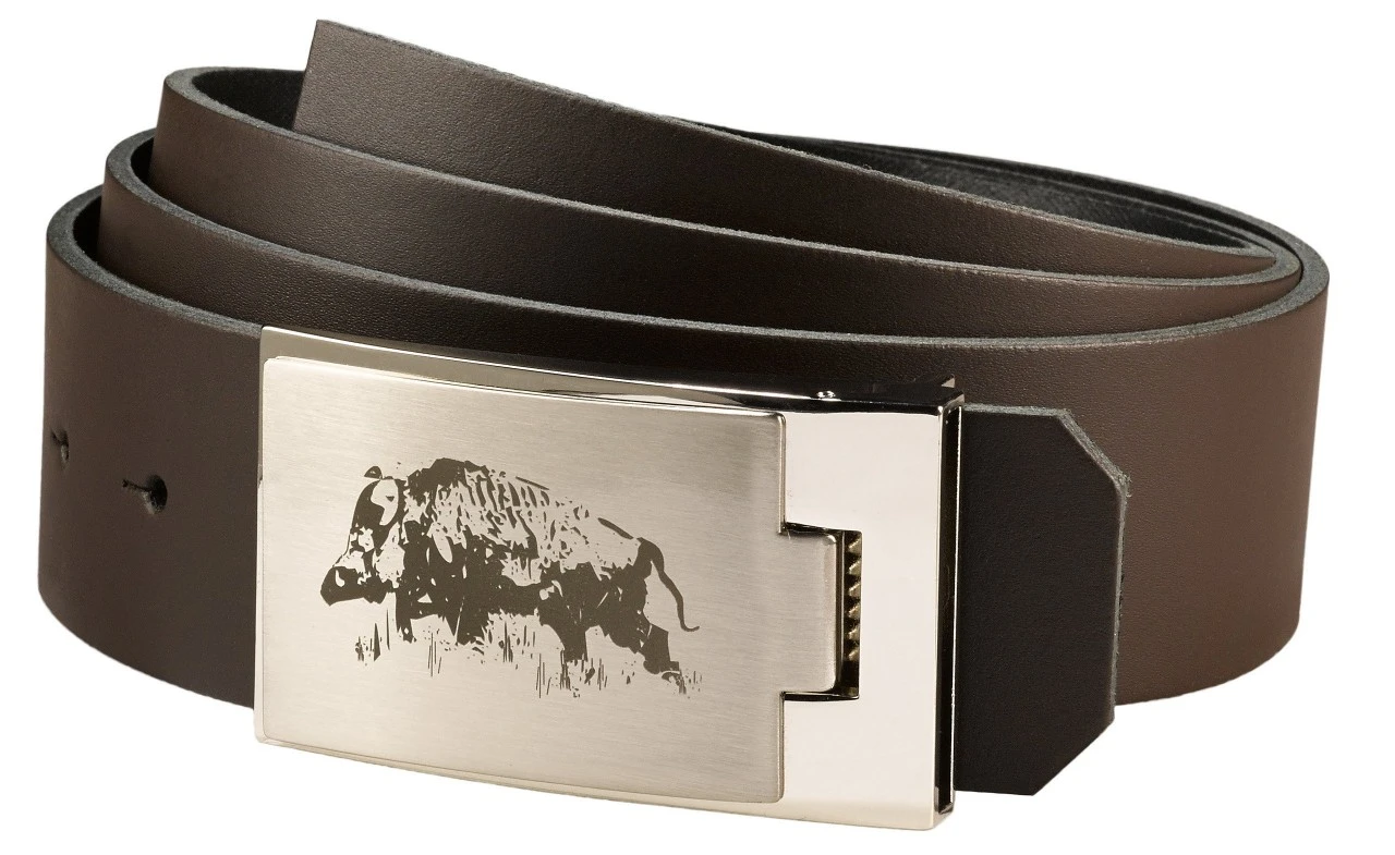 Smukt bælte af ruskind med sølvfarvet bæltespænde med dekorativt vildsvinemotiv. Bredde 4 cm. Længde 135 cm. Kan afkortes efter behov.