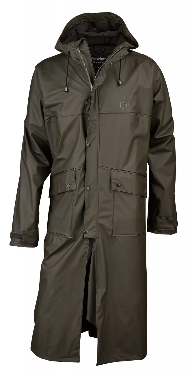 Med Deerhunters vind- og vandtætte regnfrakke, Hurricane, er du i læ for selv det kraftigste regnvejr. Takket være det ekstra lange og bevægelsesvenlige snit er du godt beskyttet mod regn og vind fra top til tå. Deerhunters regnfrakke, Hurricane er forsynet med et let polyester-inderfor og en hætte, der kan fastgøres med snørelukning. Den praktiske, tovejs lynlås har hagebeskyttelse og dækkes af en dobbelt klap med trykknap Ventilationsåbningerne på ryggen og under armene giver god ventilation ved stor aktivitet. Regnfrakken er udstyret med to lommer med klap og knap. Manchetterne justeres med velcro. På bagsiden har Deerhunters jakke en slids med trykknap, som sikrer fuld bevægelsesfrihed. Kan vaskes i maskine.