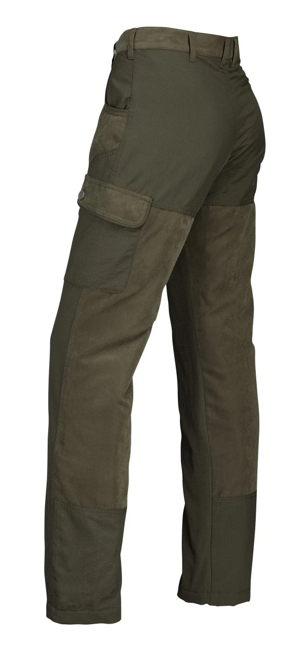 Hubertus let forede, vind- og vandtæt Hubertus dame-jagtbukser, Miporex, med Miropex-membran har normal taljehøjde og lige ben. Lydløse, takket være de børstede områder, som sikrer en lækker, blød fornemmelse. Dame-jagtbukserne er godt udstyret med to stiklommer, to lårlommer med klap og knap samt en baglomme med lynlås. Jagtbukserne er forstærket med robust trim på bagen, foran på benene, anklerne og på lommerne og lommeåbningerne.