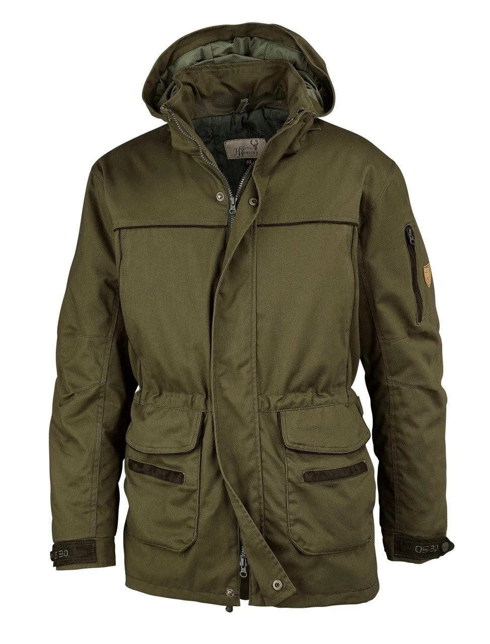 Komfortabel jakke til jagt. Robust og meget lydsvagt stof. Varmt foret. Vind-, vandtæt og åndbar takket være OS-Tex membran. To-vejs lynlås med overlapning og trykknap. For formede albue områder. Ærme afslutning med trykknap, og justerbar talje med snøre. To brystlommer med lynlås. To fleece-forede lommer. To indvendige lommer, en med lynlås og en med velcro. En Napoleon lomme. En ærme- og en hare lomme, begge med lynlås. 100 % bomuld, for 100 % polyester, membran 100 % polyrethan. Farve Oliven. Str. 46– 64.