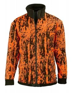 Hubertus vendbare herre-fleecejakke til trykjagt er udstyret, på den grønne side, med en fastsyet brystlomme og to sidelommer, begge med lynlås, og på den orange side med to stiklommer med velcrolukning.