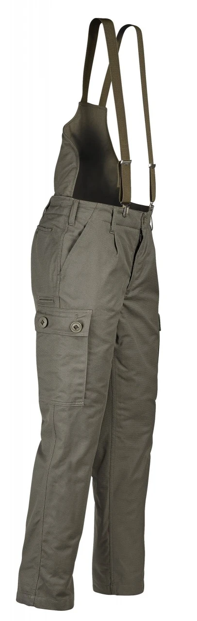 Varmt forede BW outdoorbukser med aftagelig nyrebeskyttelse og selestropper. Bæltestropper, en knivlomme til højre, to stiklommer, to lommer med knapper, en baglomme med en knap.