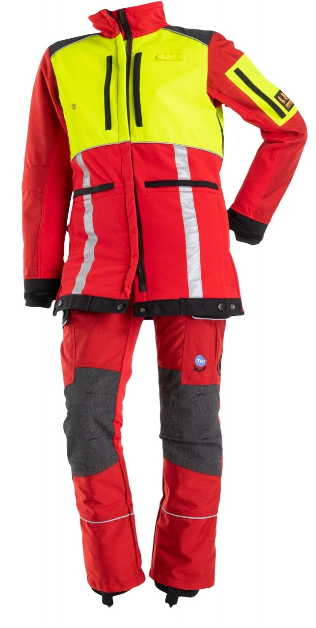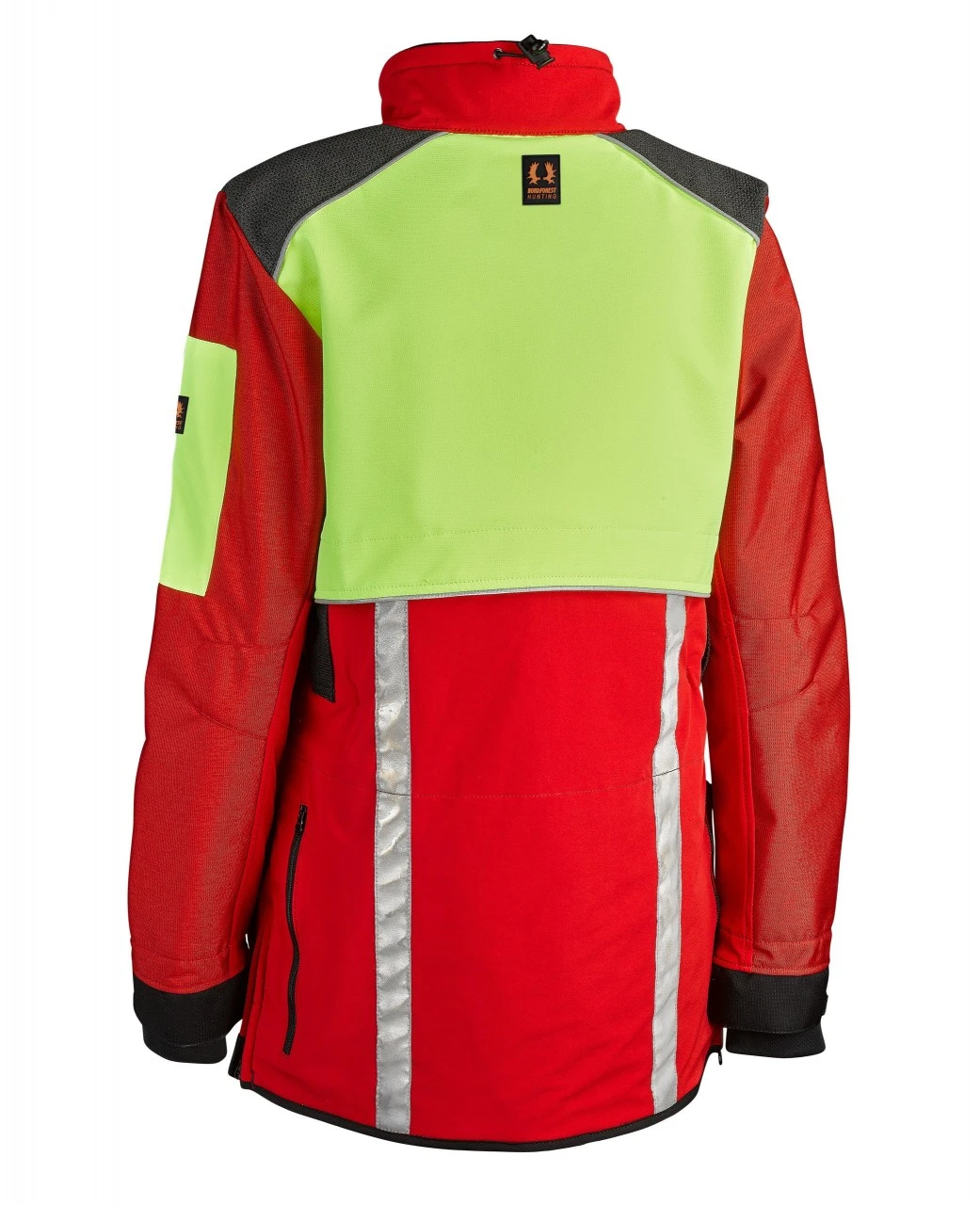 Den øverste del af kroppen er tornafvisende. Den forede kravestand kan trækkes sammen med et løbebånd for at beskytte mod blade, nåle og utøj. Riffel- og rygsækstroppen glider ikke ned af skulderbesætningen lavet af robust Cordura. Afstandsstoffet bagpå og ventilationszonerne underlagt med mesh under klappen på ryggen og under armene sikrer god luftcirkulation.