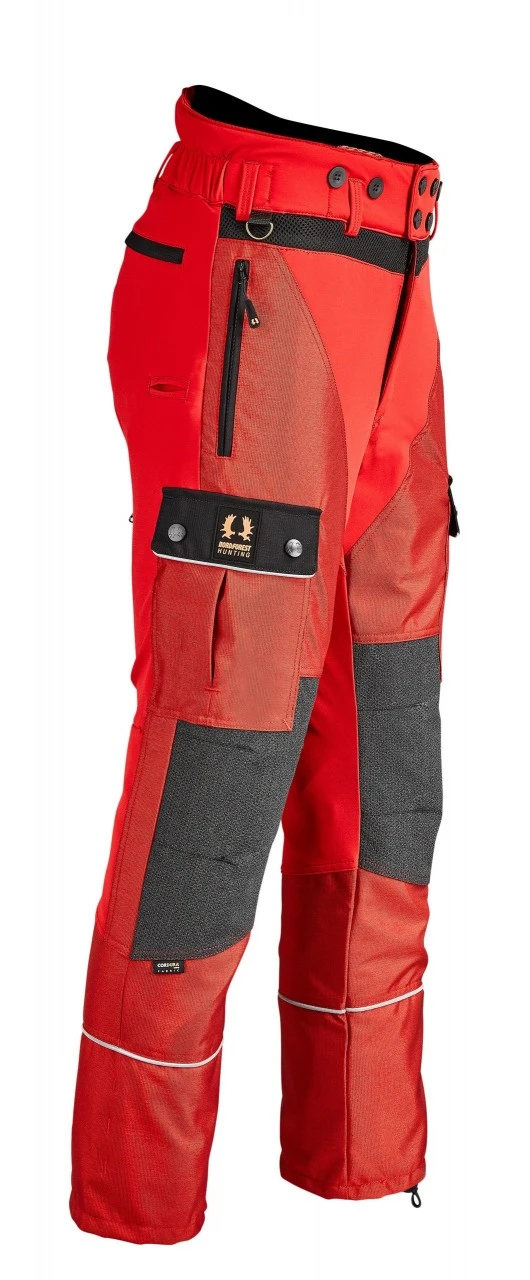 - Komplet perforeringsbeskyttelse foran og bagpå ned over knæet. Benets sømme er fuldstændigt dækkede med stikresistente indlæg og fastsyet individuelt