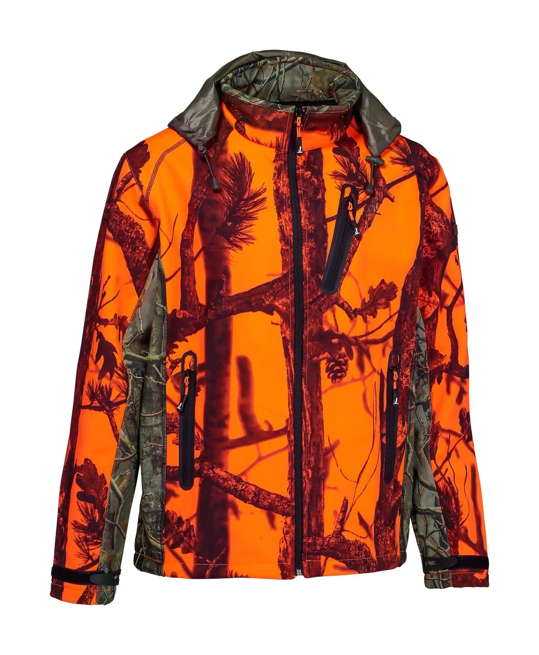 Percussions softshelljakke til herrer er udstyret med to stiklommer og en brystlomme, alle med lynlås, og med meshfor samt to meshinderlommer. Desuden en stor vildtlomme med vandtæt for og lynlåse i begge sider.