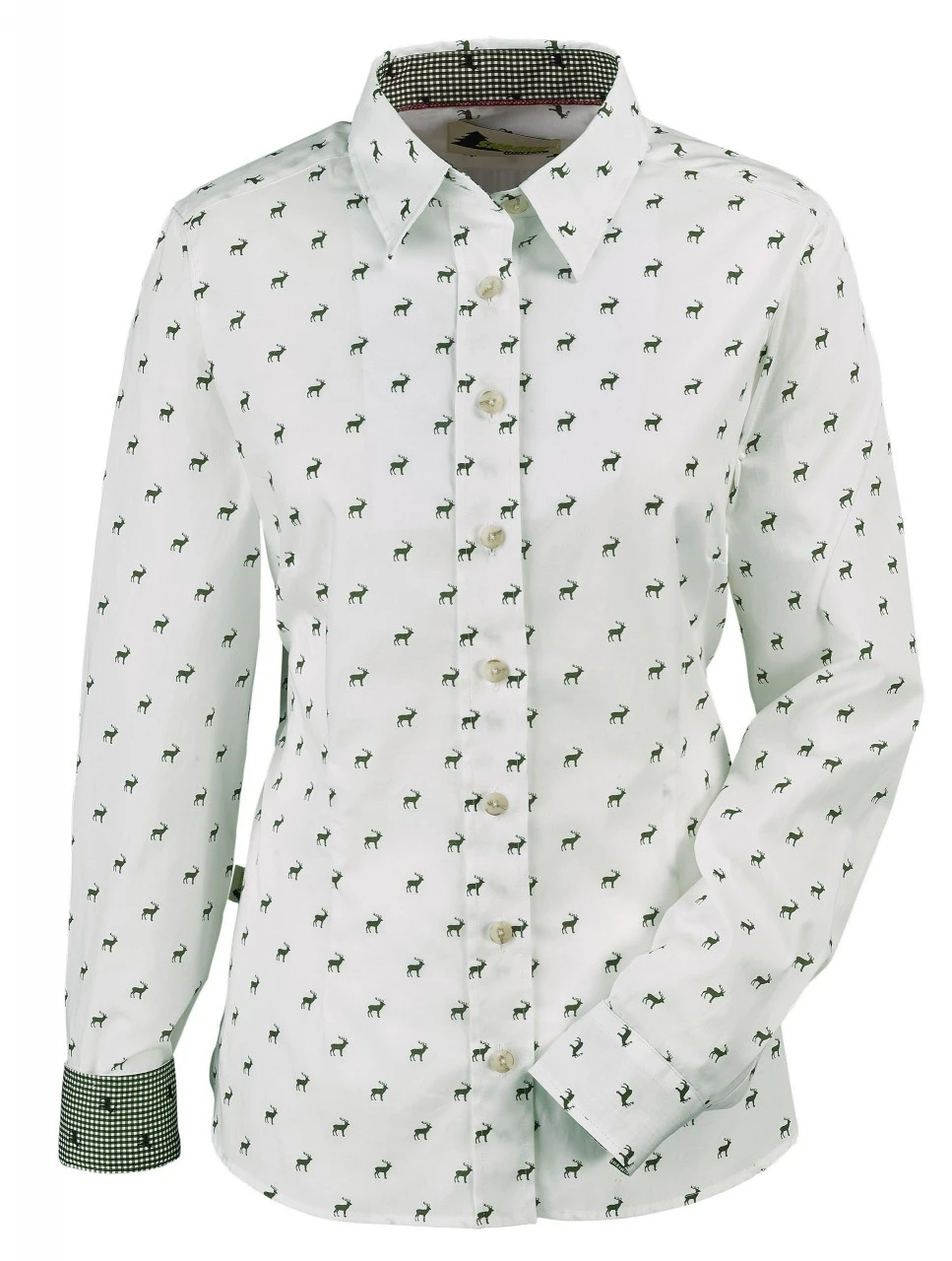 Skogens smarte, langærmede damebluse med hjortemotiv er næsten for lækker til at tage af igen. Det giver dit tøj et trendy, trachtenlook. Perfekt med nederdel, bukser eller jeans.